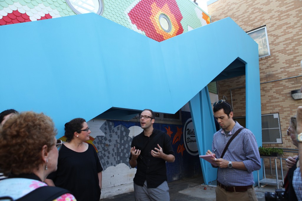 10.18.16: As part of Archtober’s Building of the Day series, WORKac’s Sam Dufaux led tour-goers through PS7’s Edible School Yard, which includes a pixilated flower-pattern greenhouse.