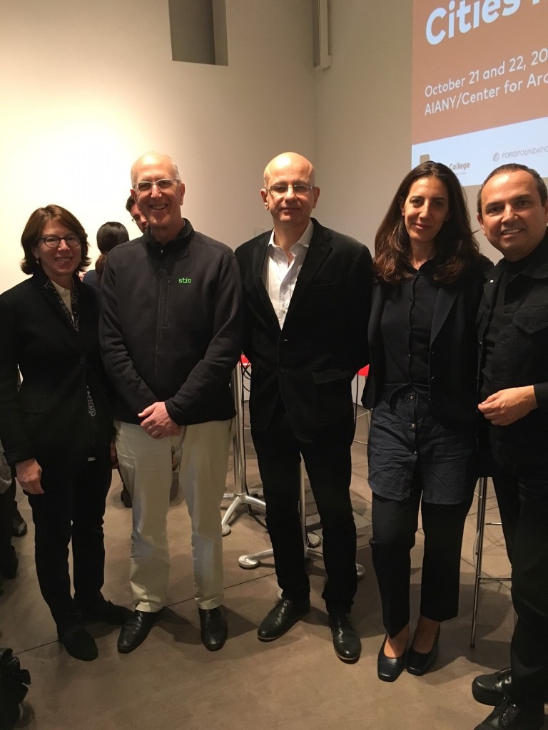 10.22.16: At “Art, Politics, and Cities in Transition: Public Space and Creative Placemaking,” panelists discussed the role of art and creative industries in urban regeneration. (l-r) Carol Loewenson, FAIA, LEED AP, 2016 AIANY President; Jerold Kayden, Department of Urban Planning, Harvard University Graduate School of Design; Omar Nagatiand Beth Stryker, Founding Partners, CLUSTER; and Teddy Cruz, Director, UCSD Center for Urban Ecologies.