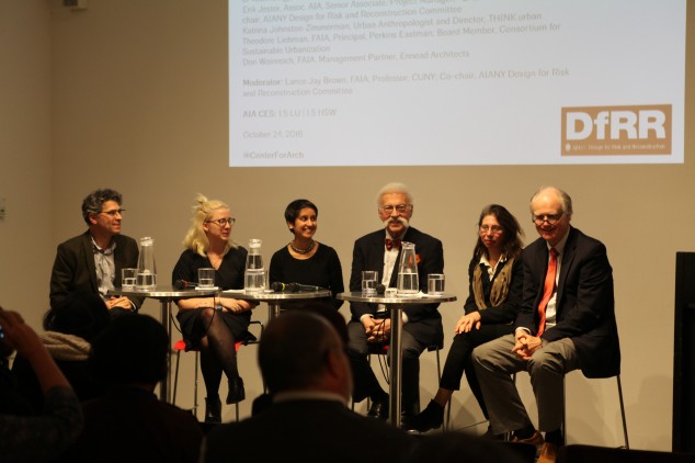 10.24.16: The AIANY Design for Risk and Reconstruction Committee brought together architects, city officials, and scholars to discuss design’s role in alleviating the global refugee crisis. (l-r) Don Weinreich, FAIA, Management Partner, Ennead Architects; Katrina Johnston-Zimmerman, Urban Anthropologist and Director, THINK.urban; Nisha Agarwal, Commissioner, NYC Mayor’s Office of Immigrant Affairs; Theodore Liebman, FAIA, Principal, Perkins Eastman, Board Member, Consortium for Sustainable Urbanization; Deborah Gans, FAIA, Founder and Principal Architect, GANSstudio; Urs P. Gauchat, Hon. AIA, Dean, College of Architecture and Design, New Jersey Institute of Technology, Board Member, Consortium for Sustainable Urbanization. Not pictured: Floris Alkemade, Chief Government Architect, The Netherlands.