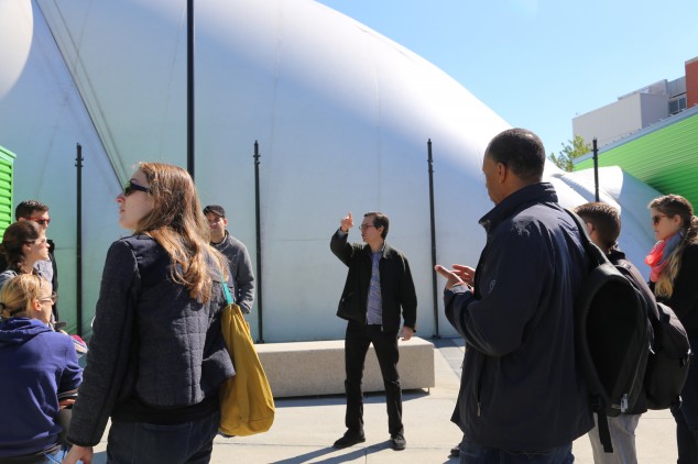 10.05.14: Ricardo Zurita, AIA, LEED BD+C, commented on the contrast between the soft, white fabric that encloses the tennis courts beginning in October and the bright green geometric structure during a Building of the Day tour of Sportime/John McEnroe Tennis Academy on Randall’s Island.