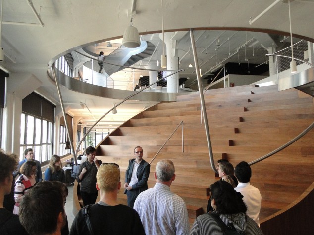 10.14.14: Sam Dufaux, associate principal at WORK Architecture Company (WORKac) describes the “coin” stair at Wieden+Kennedy during the Archtober Building of the Day tour.