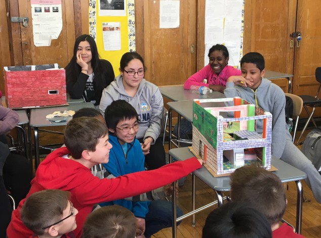 Back at IS 234, design educators Dustin Atlas and Tim Hayduk worked in 12 classrooms guiding teams of students in designing and building models of a story retail space. Requirements included an ADA-accessible restroom, stairway, and manager’s office. The rest of the design was at the whim of each group of students. Students were required to work with the ½” scale, calculate the slope of the stairway and determine the number of steps needed, and develop two-dimensional nets that fold into three-dimensional pieces of furniture and store fixtures. It was evident that students were grasping an inner sense of scale as they created details both large, such as a sign on their store’s exterior, or small, such as tiny pastries for the bookstore/café.