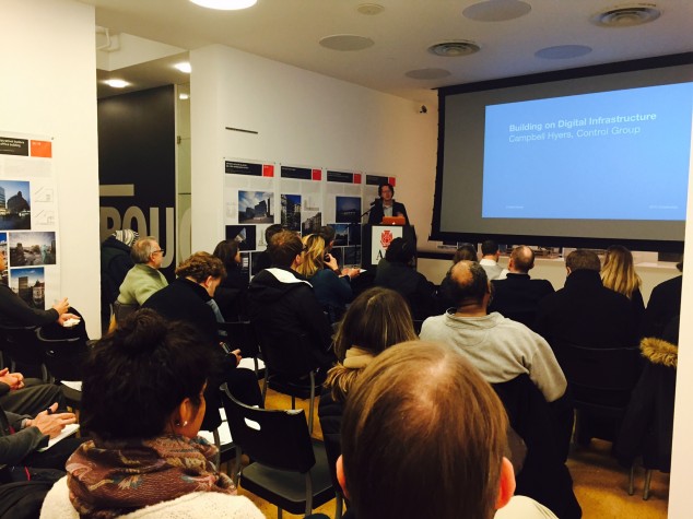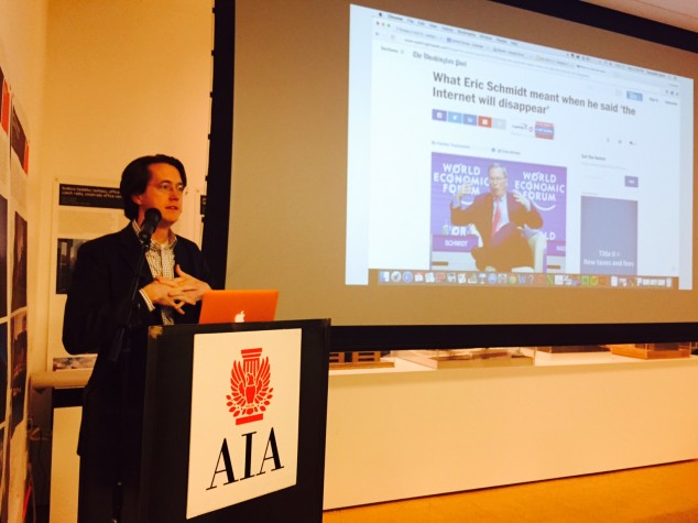 Building on his previous presentations in the Transforming Architectural Practice (TAP) series, Campbell Hyers, CEO and co-founder of Control Group, returned to the Center for Architecture to further reveal how digital infrastructure is disappearing, to paraphrase Google CEO Eric Schmitt. Hyers presented a number of projects and, more importantly, processes that show how the Internet is “being absorbed in the world around us.” This vanishing digital infrastructure will help people navigate, shop, and communicate – and also maintain the civic realm.