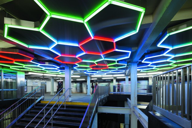 Speaking to the history of the program, Menschel pointed to the beautiful, open architecture by quoting the 1902 commissioner of New York’s Rapid Transit Railroad, when he said that all subway stations in the city were to be “designed, constructed, and maintained with a view to the beauty of their appearance, as well as to their efficiency.” Menschel also called attention to the icons of the original IRT system, such as the beavers of the Astor Place 4/5/6 Station (the Astor fortune started with fur trading). These icons acted as placemakers, particularly in communities of non-English speaking immigrants. Art in the transit system continues to not solely inspire commuters or brighten our underground surroundings, but perform a key role in placemaking. Fulton Center, the newest and boldest example of this practice, captures the intersection of art, public architecture, and infrastructure. As also evident in the new Fulton Center, MTA Arts is not shying away from digital art. No longer needing to cross paths with a particular station, commuters and art lovers can check on their favorite installations and discover new ones via any digital pathway on The MTA Arts & Design App, or purchase the newly published New York’s Underground Art Museum: MTA Arts for Transit in print.
