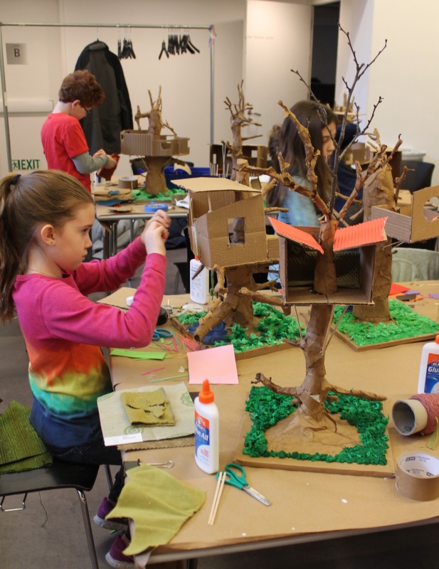 Back at the Center, the young architects worked on crafting trees out of wood, branches, and paper mache, taking extra care to make sure the branches were sturdy enough to support their houses. Once the trees were complete, students got to work building their one-of-a-kind treehouses out of a variety of different materials. The challenge was to build the house to fit securely in the unique arrangement of branches. The creativity in the results was incredible! These young architects included ladders, swings, sliding doors, pulley systems, and more. Two of the treehouses even linked together by a bridge.