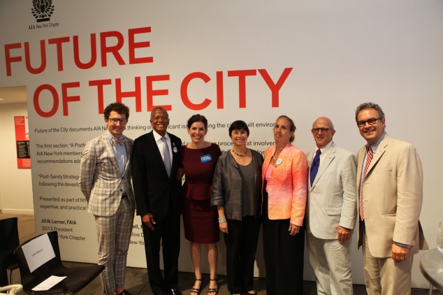 Overall, the event was as much a competitive presentation of positions as a design forum – as audience members could readily predict before the proceedings began, when the candidates’ staffers distributed a flurry of glossy campaign flyers. Chaban and Bell shared the difficult cat-herding role of keeping the speakers on topic, and were largely successful in curbing the inevitable tendencies to present campaign boilerplates and amplify relatively minor differences. Since AIANY has presented strong public positions through the Platform, and since both AIANY President Jill N. Lerner, FAIA, and 2014 President-Elect Lance Jay Brown, FAIA, have expressed interest in continuing to involve city officials and office seekers in the Center’s debates, the vigor and frankness displayed at this event create a promising precedent for future panels. There’s no reason why candidates for BP, City Council, or Mayor shouldn’t look regularly to the AIANY community as a critical crucible for policy formation, before and after elections.